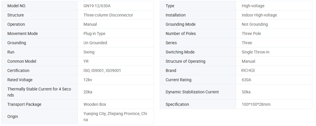 GN19-12(c) series indoor AC altae intentionis solitudo switch apta est ad AC 50hz,rated intentione laboranti 12kv, 10kv, aestimavit operando currenti 400A, 630A, 1250A potentiae systematis, ut intentione et nullo onere sub conditione fractionis, circumitu indoor switchgear.rated intentione clauditur 12kv et infra systematis potentiae, operando mechanismo manuali instructum, adhibito ad mechanism mutandi adjumenta sub conditione intentionis sed sine onere, Etiam missae sunt ad producendum genus anti-foedum, genus campestri, et machinis vivis proponere quae institui possunt. GN19-12 series umbraticarum altarum voltagenarum secludentium switch est machinatio umbratica cum voltage 12kv et trium phase AC 50hz aestimatarum.