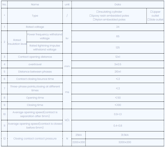 Main Technical Specification of VBI, XXIV latus mounted Type VCB